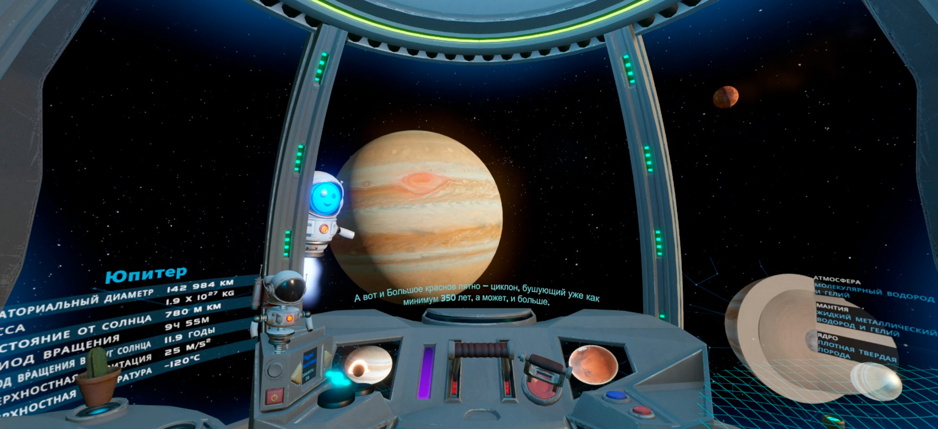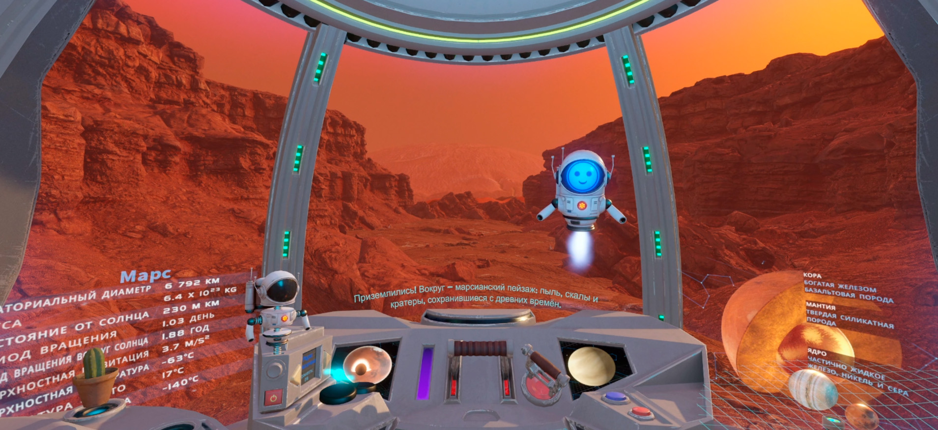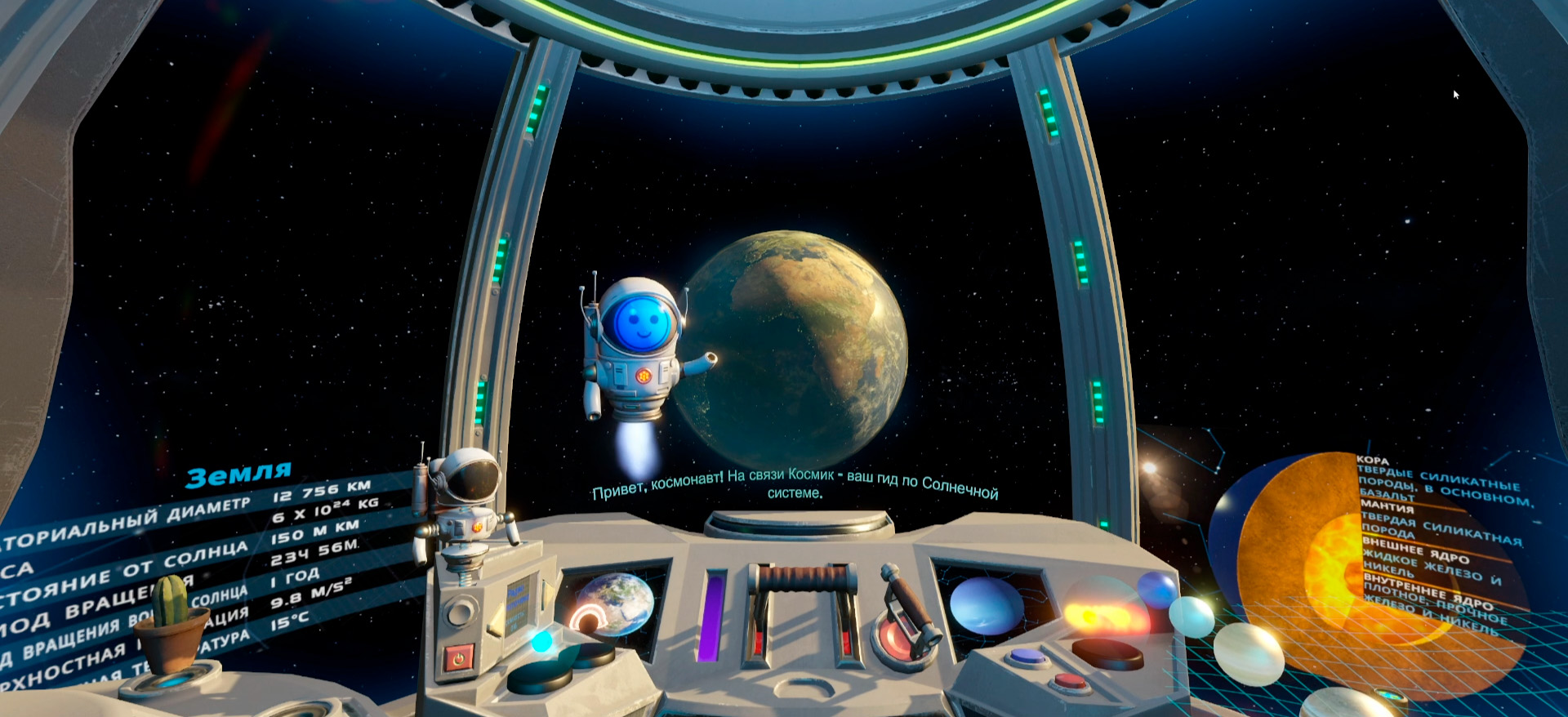 Интерактивные элементы. Школьник может взаимодействовать с объектами внутри кабины корабля, кнопками, панелями и информационными экранами, что усиливает вовлечённость в процесс обучения.